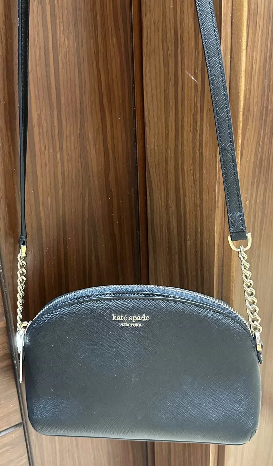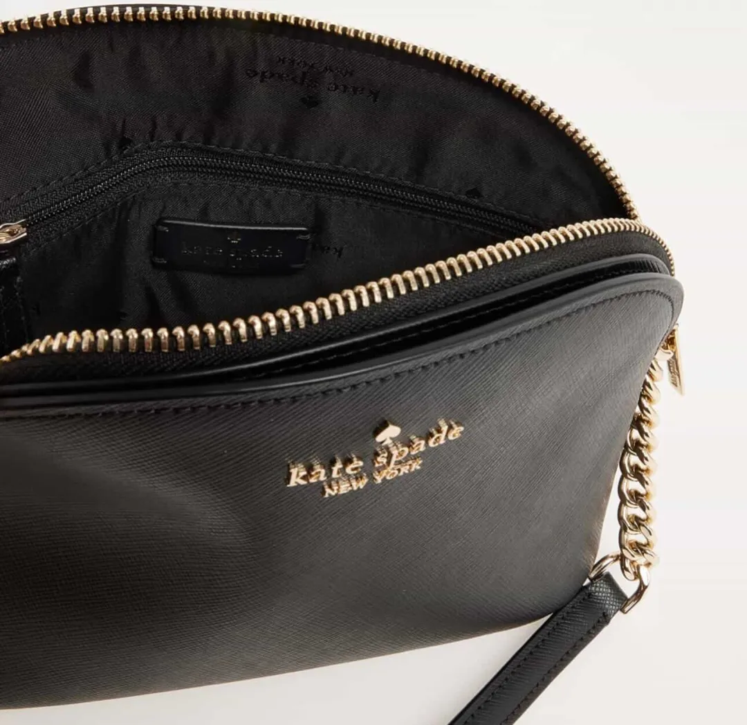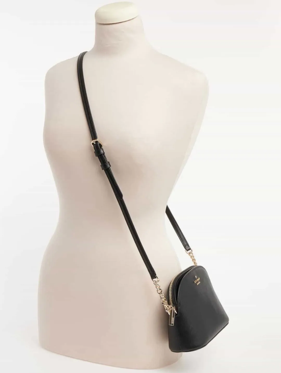 لخامة: جلد "Saffiano" الفاخر المقاوم للخدش والماء، مما يضمن بقاءها بمظهر جديد لفترة طويلة. التصميم: شكل "Dome" كلاسيكي مع شعار الماركة والقلب المعدني باللون الذهبي المطفي. الحزام: حزام طويل قابل للتعديل لارتدائها بشكل "Crossbody" مريح. الإغلاق: سحاب علوي متين يضمن أمان مقتنياتكِ. اللون: أسود ملكي يليق بجميع ألوان ملابسكِ.