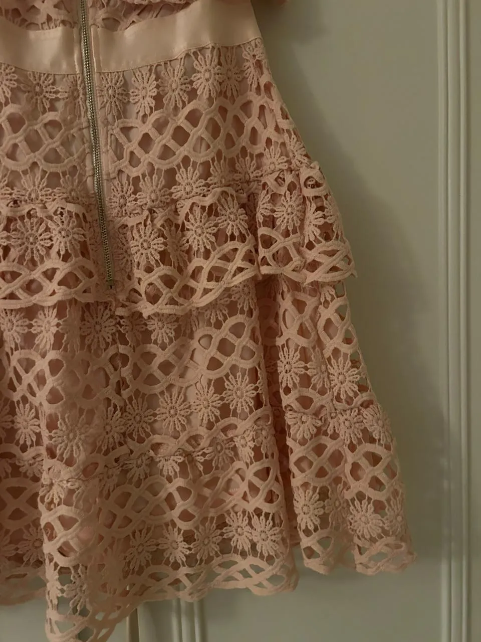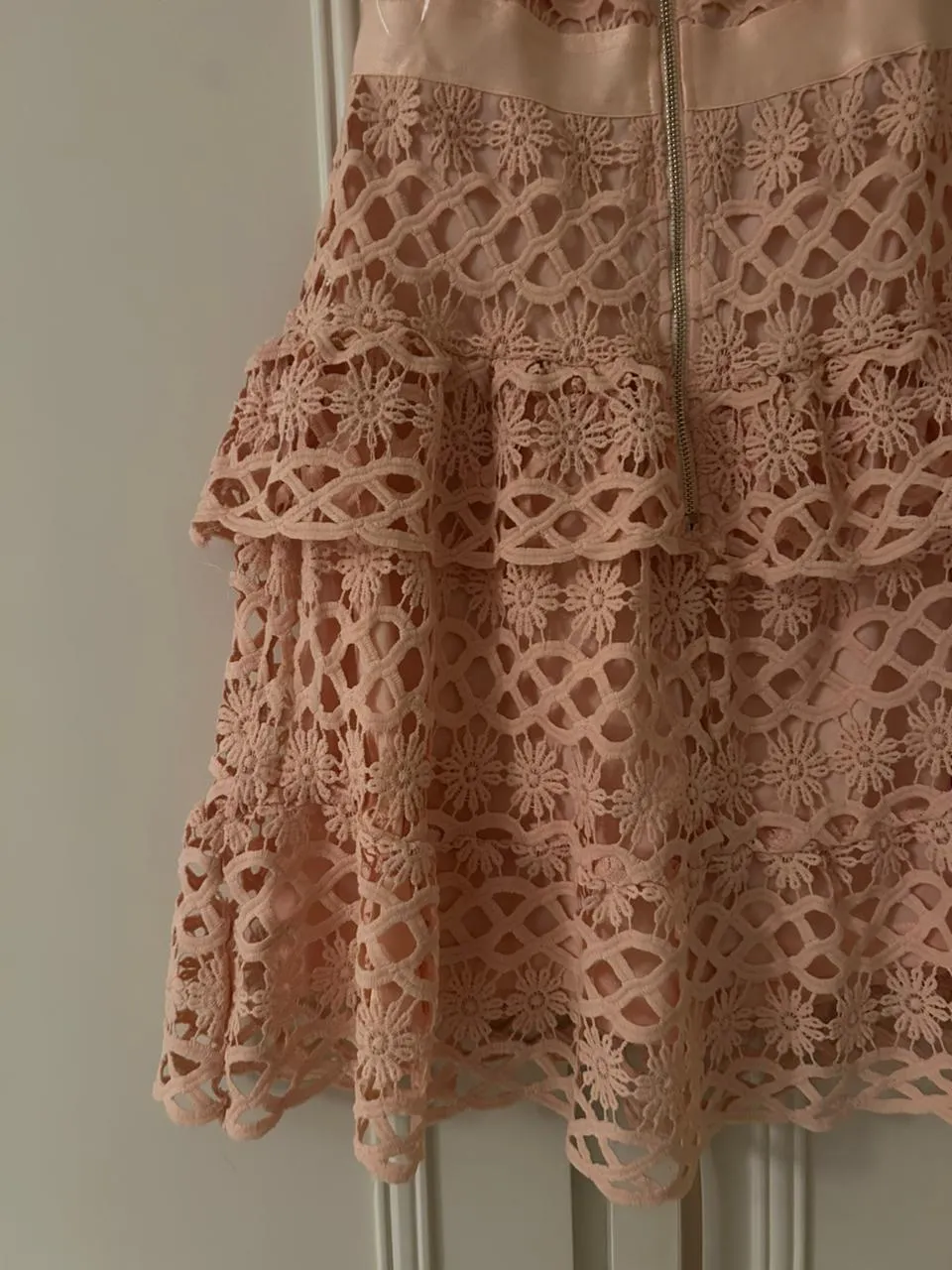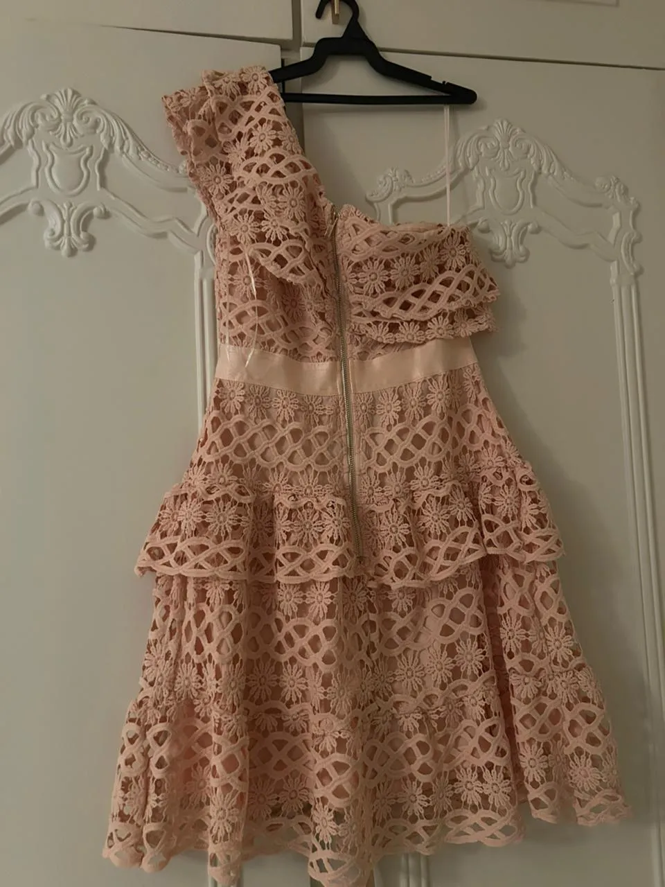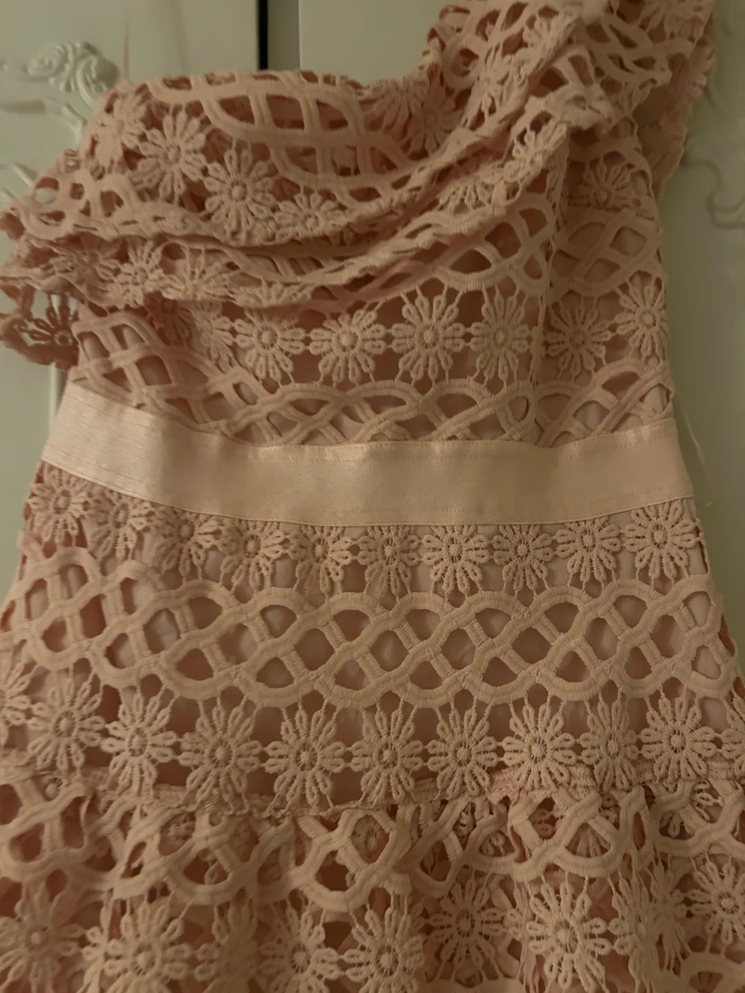 الماركة: Lily Mcbee (تم شراؤه من موقع ASOS العالمي). التصميم: فستان قصير "Off-shoulder" بكتف واحد، يتميز بتفاصيل الدانتيل المفرغ (Guipure Lace) بنقوش ورد جذابة وطبقات (Ruffles) تمنح حركة وحيوية للتصميم. اللون: مشمشي فاتح / نود (Peach/Nude) ناعم جداً. المقاس: Small (S). الحالة: ممتازة جداً (شبه جديد)، استُخدم مرة أو مرتين فقط. العيوب: لا يوجد أي عيوب، القطعة بحالة الوكالة.
